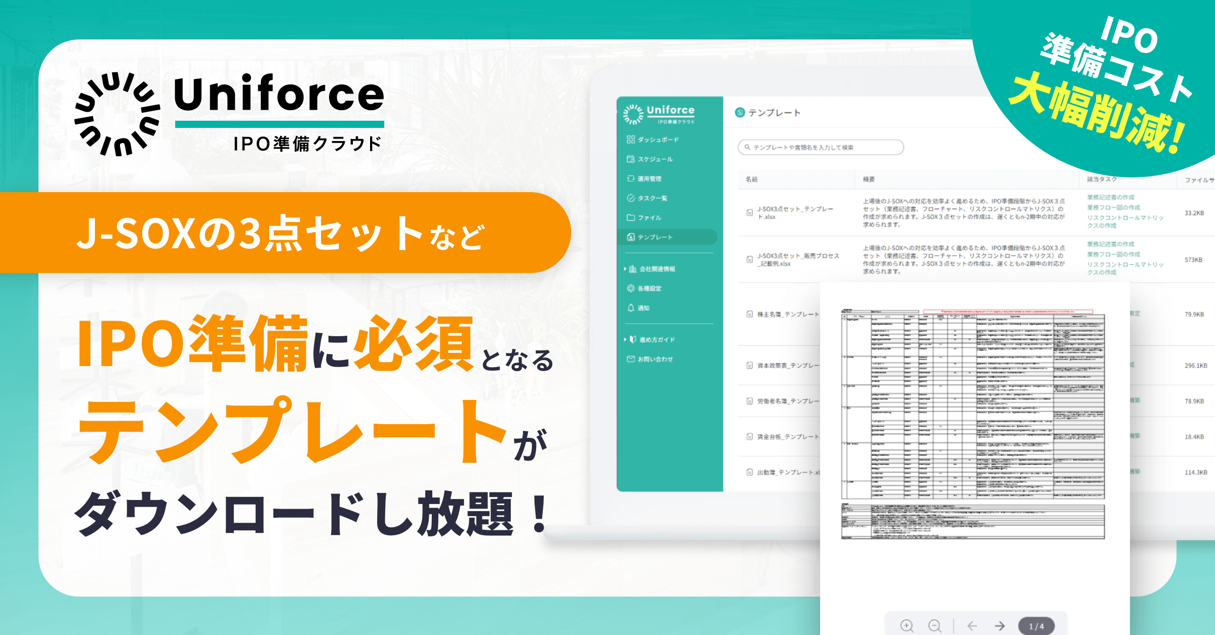 【Uniforce -IPO準備クラウド-】 IPO準備に必要な"J-SOXの3点セット"などの資料のテンプレート提供を開始!