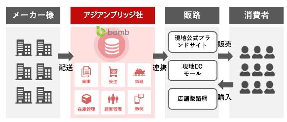 アジアンブリッジ社が提供するクラウド型海外販売システム「bamb」は、進出したいアジアの国々に会社を設立することなく、その国に在庫を置きながら事業展開ができるクラウド型現地通販システムであり、その在庫と会計を一元管理できます。また現地で配信する広告のローカライズや物流、許認可や申請関連をアジアンブリッジ社がワンストップでサポートしており、現地法人を設立せずとも、まるで自社の現地拠点があるかのように進出することが可能となります。