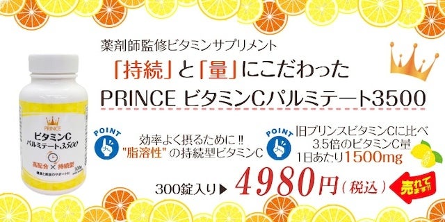 一方で、「プリンス ビタミンCパルミテート3500」は、ビタミンCにパルミチン酸を結合させた脂溶性のビタミンC誘導体です。長時間体内にとどまり、効率的にビタミンCを補給することが期待できます。