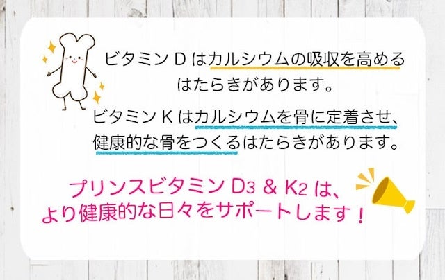 「プリンス ビタミンD3&K2」は、1粒にビタミンD3を250.0マイクログラム(10000IU)と、高単位に含有しております。さらに、カルシウムを骨に定着させ健康な骨をつくるはたらきがあるビタミンK₂を100マイクログラム配合したサプリです。