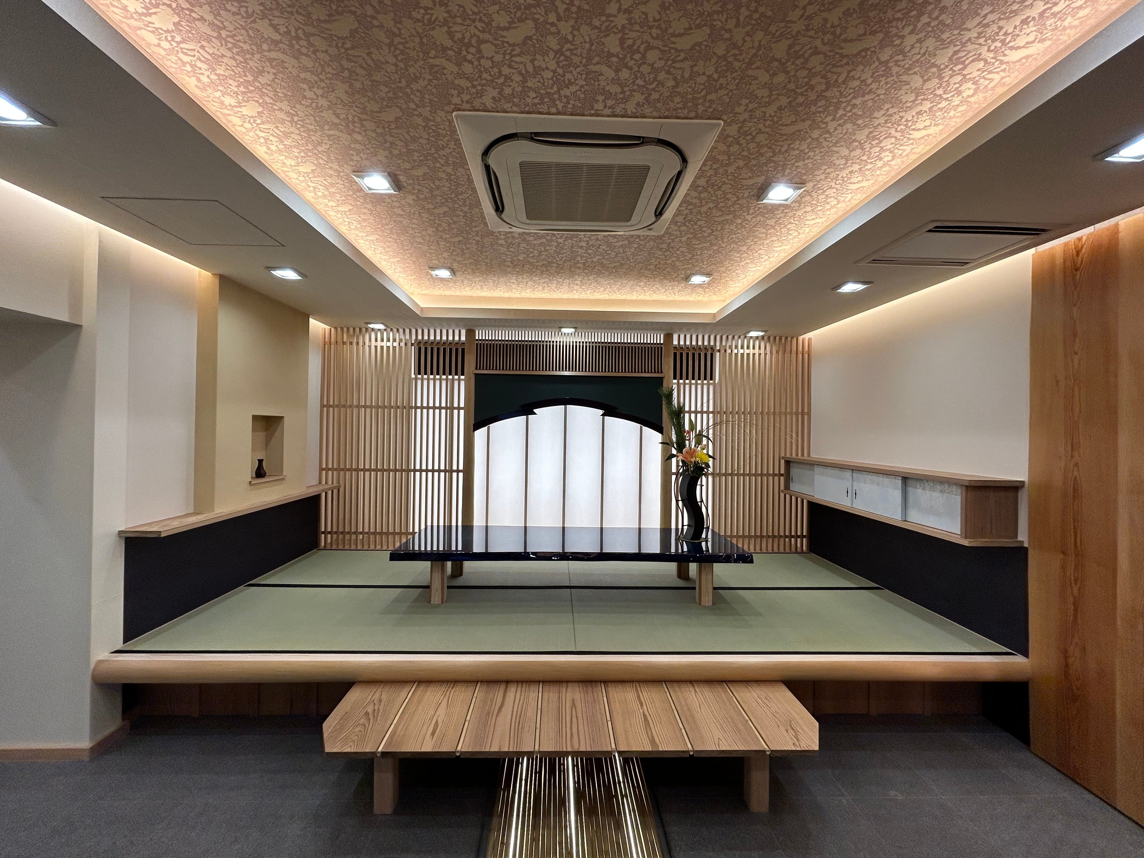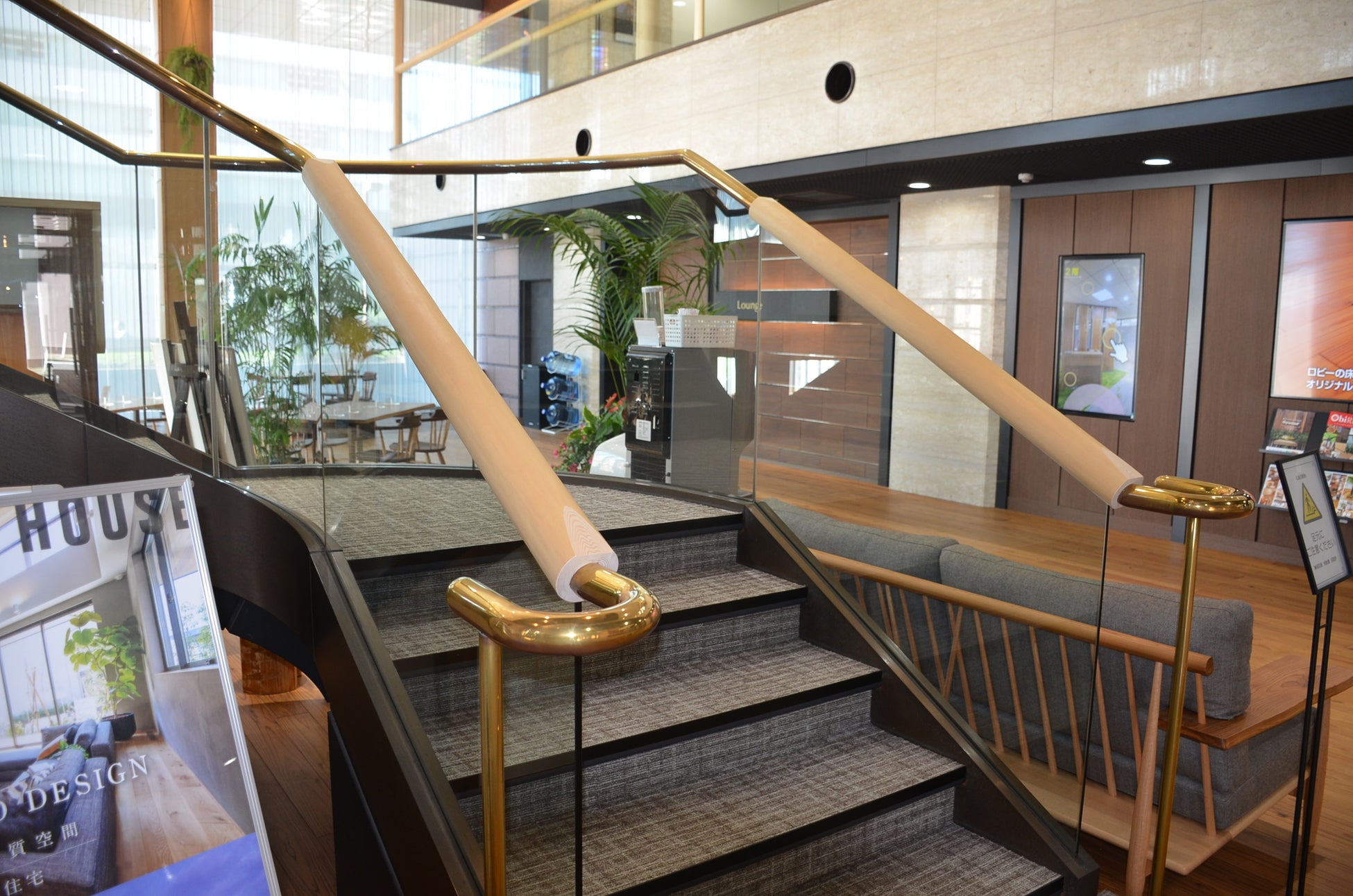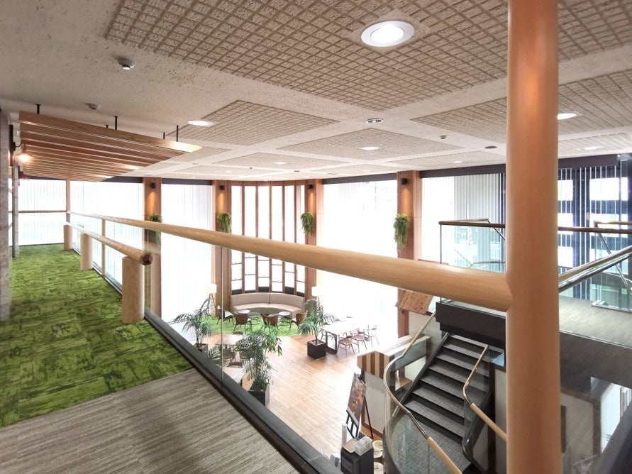 当社は、2022年より本社ビルの木質化リノベーションを進めており、その一つとして、1階ロビーにおけるらせん階段の手摺の一部及び2階接客スペースの手摺の一部に北山杉の磨き丸太を被せ、木質化いたしました。また、同じく1階ラウンジの一部について、北山杉の天然絞り丸太と磨き丸太を活用した和室のモデル展示スペースを設置いたしました。約600年もの歴史を誇る北山杉の緻密な材質やなめらかで光沢のある美しい木肌など、その優美さを来訪された皆様にご体感いただいております。