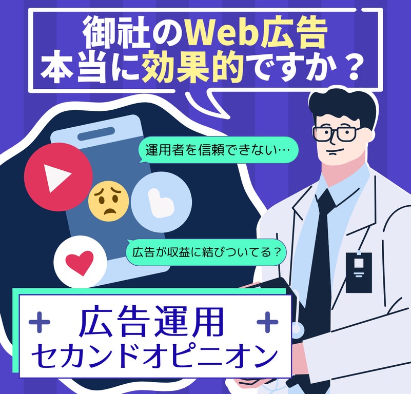 本サービスは、広告代理店に広告運用を依頼している、もしくは社内で広告運用をしている企業の広告運用アカウントをセカンドオピニオンとして分析し、目標に向けた改善案を提示させていただくサービスです。当社が広告代理業、広告運用を行う内容ではございません。