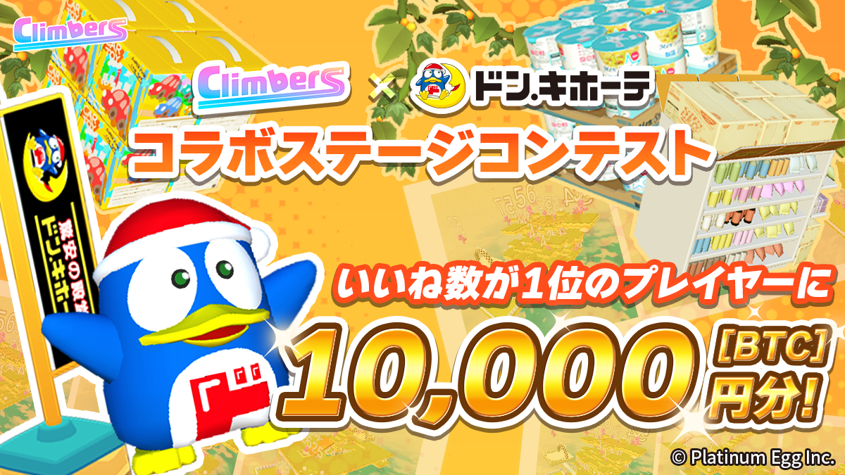 ブロックチェーンゲーム、NFT開発を手掛ける株式会社プラチナエッグ(本社:東京都文京区本郷、代表取締役:竹村也哉)は、賞金付きバトルロイヤルレース「クライマーズ(Climbers)」と総合ディスカウントストア「ドン・キホーテ」とのコラボイベントを2024年1月23日より開始したことを発表いたします。