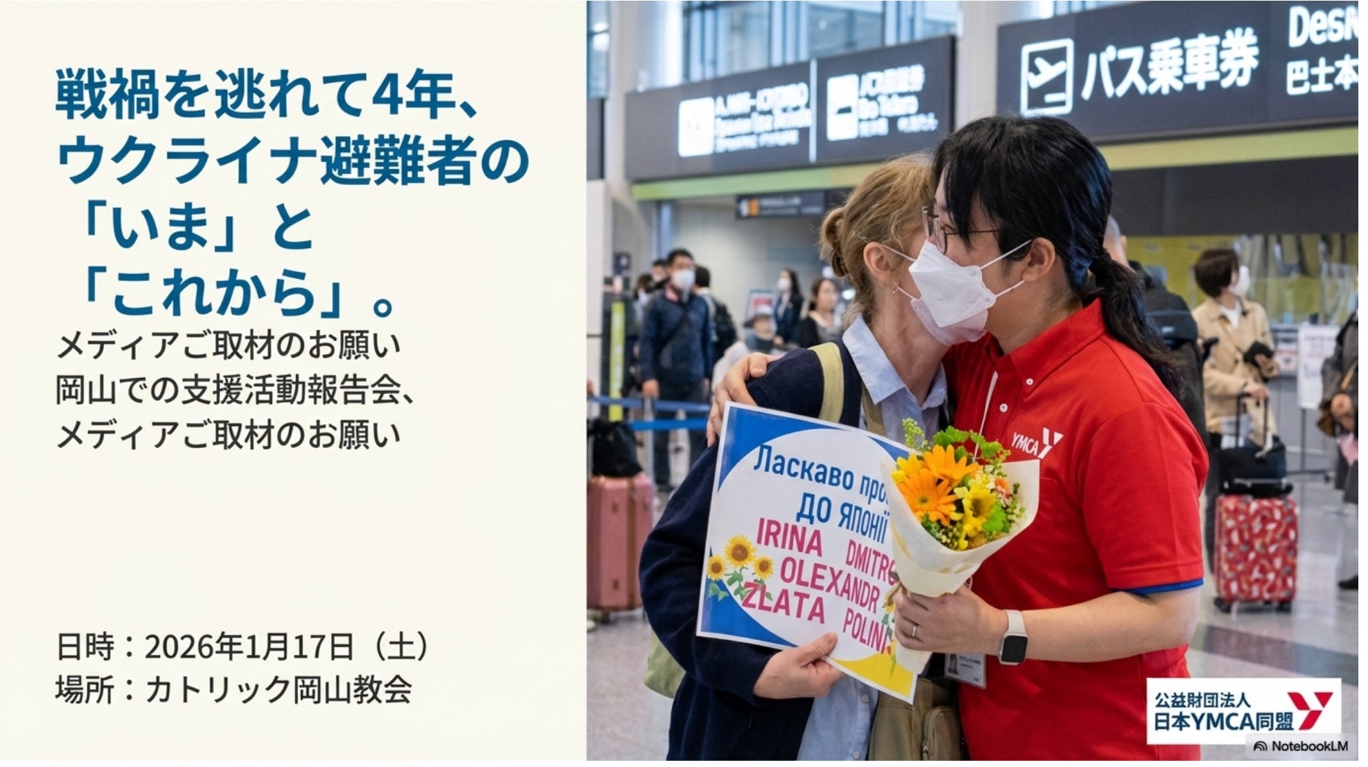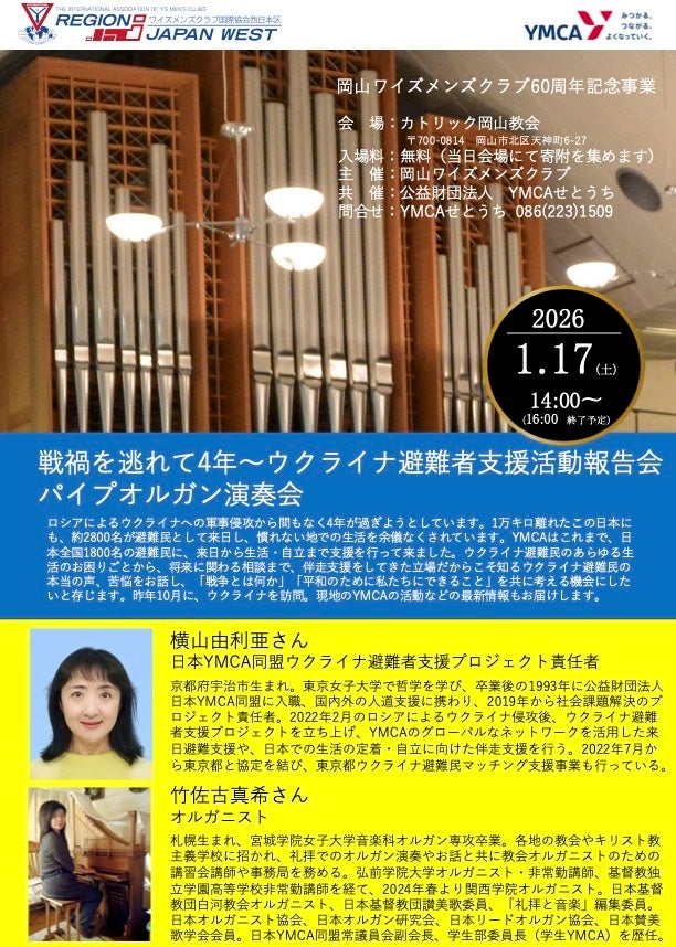 岡山ワイズメンズクラブおよび公益財団法人YMCAせとうちは、2026年1月17日(土)14:00より、カトリック岡山教会にて「戦禍を逃れて4年~ウクライナ避難者支援活動報告会 パイプオルガン演奏会」を共催いたします。ロシアによる軍事侵攻から間もなく4年、日本で暮らすウクライナ避難者の現状と課題を伝え、地域社会と共に平和について深く考える機会を創出することを目的としています。支援の最前線からの報告と荘厳なパイプオルガンの音色が響き合う本イベントは、中国地区では極めて希少な機会となります。