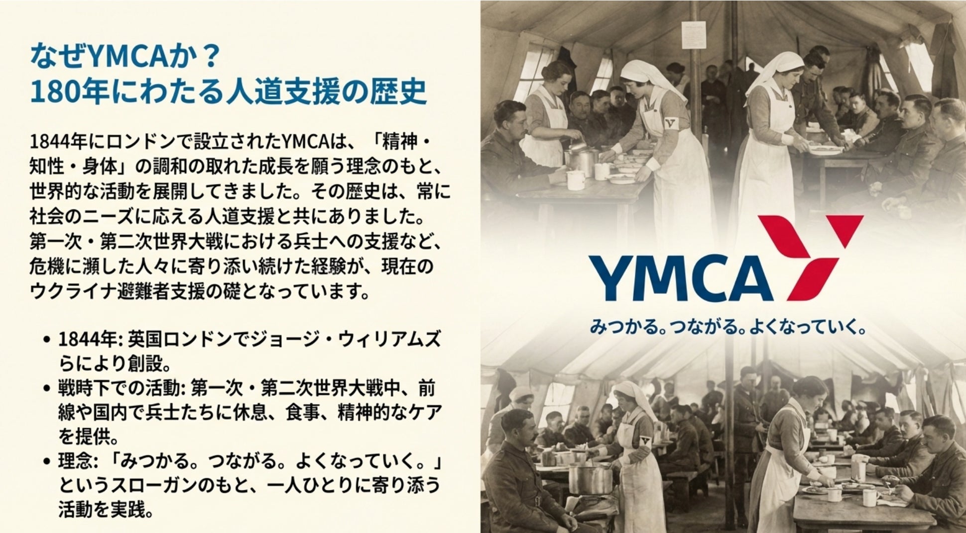 今回のウクライナ避難者支援における「伴走支援」は、まさにこの歴史と伝統に連なる活動です。世界120の国と地域に広がるYMCAのグローバルなネットワークが、出国前から来日、そして日本での生活定着に至るまで、切れ目のない包括的な支援を可能にしています。YMCAは、ブランドスローガンである「みつかる。つながる。よくなっていく。」を体現し、一人ひとりに寄り添い続けます。