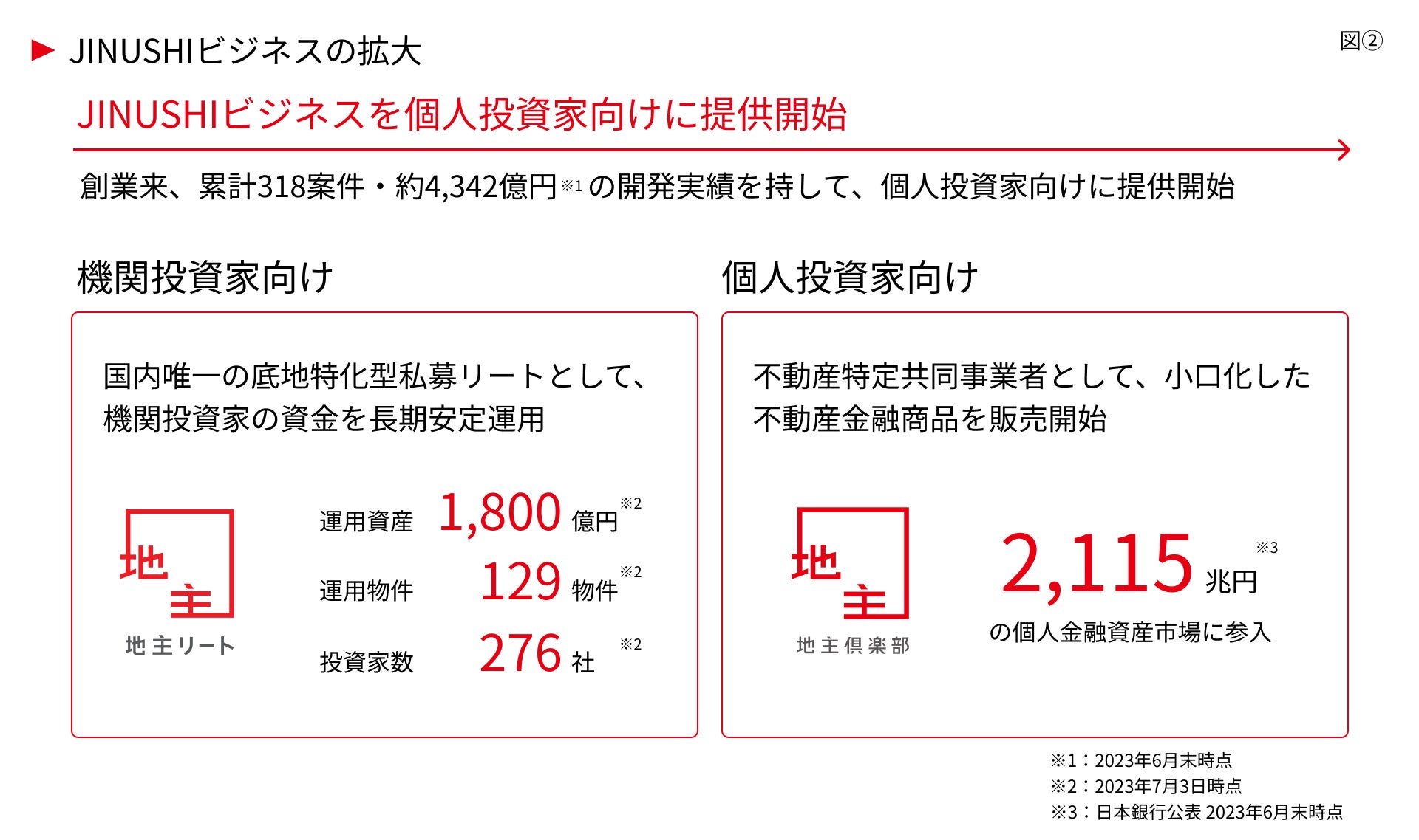 こうした実績をもとに、JINUSHIビジネスを新たに個人投資家向けに提供する目的で、本年5月、当社の100%子会社である地主フィナンシャルアドバイザーズ株式会社は不動産特定共同事業の許可を取得いたしました。本許可に基づき、個人投資家向け不動産金融商品「地主倶楽部」の提供を開始いたします。