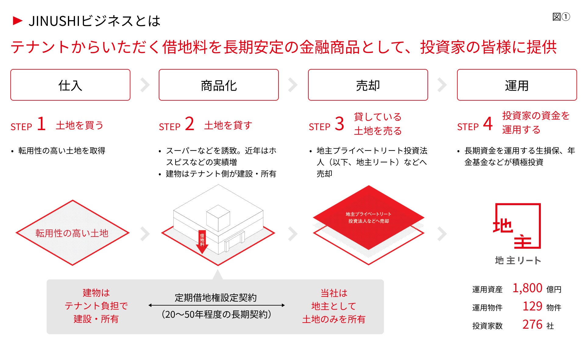 JINUSHIビジネスに特化した、東証プライム市場上場の不動産金融商品のメーカーです。2000年の創業以来、定期借地権を活用し、土地のみに投資するJINUSHIビジネスを行ってまいりました。