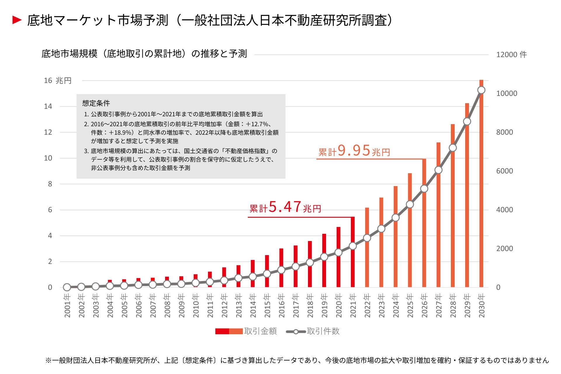当社は創業来20年超、底地(注3)開発のパイオニアとして、JINUSHIビジネスを通じて底地マーケットの創出・拡大に注力してまいりました。その結果、底地マーケットは、直近10年間で約5倍の5兆円市場へと成長しており、今後5年間で10兆円市場へと成長する見込みです(参考:後記「底地マーケット市場予測」)。