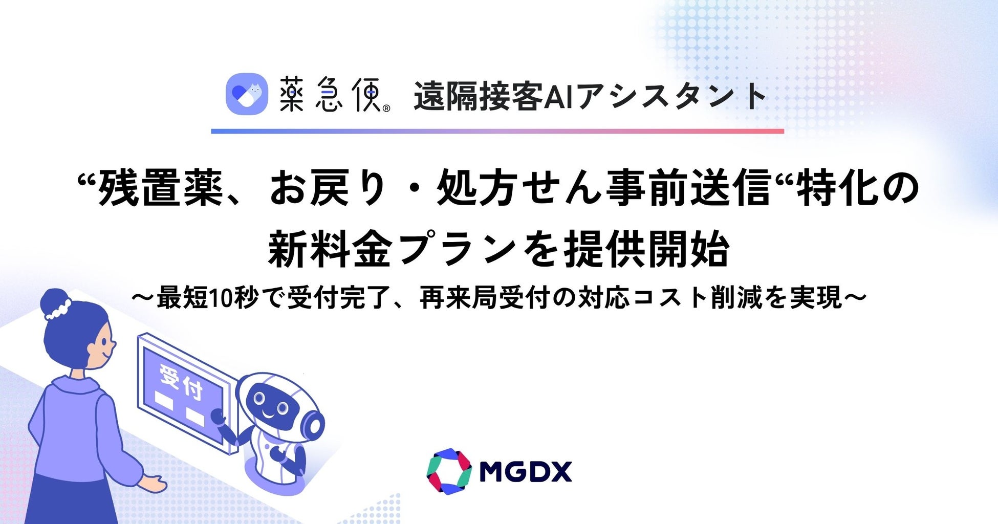株式会社サイバーエージェント(本社:東京都渋谷区、代表取締役:藤田晋、東証プライム市場:証券コード4751)の連結子会社である医療AIカンパニー、株式会社MG-DX(本社:東京都渋谷区、代表取締役:堂前紀郎、以下「当社」)は、薬局特化型の接客AIエージェント「薬急便 遠隔接客AIアシスタント」において、再来局・お戻り・処方せん事前送信など“残置薬対応”に特化した新プランの提供を、2025年7月3日より開始したことをお知らせします。