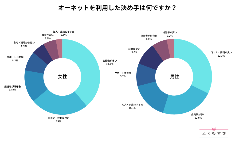 ・女性がオーネットを利用した決め手は、会員数が多いが1位、口コミ・評判が良いが2位となりました。