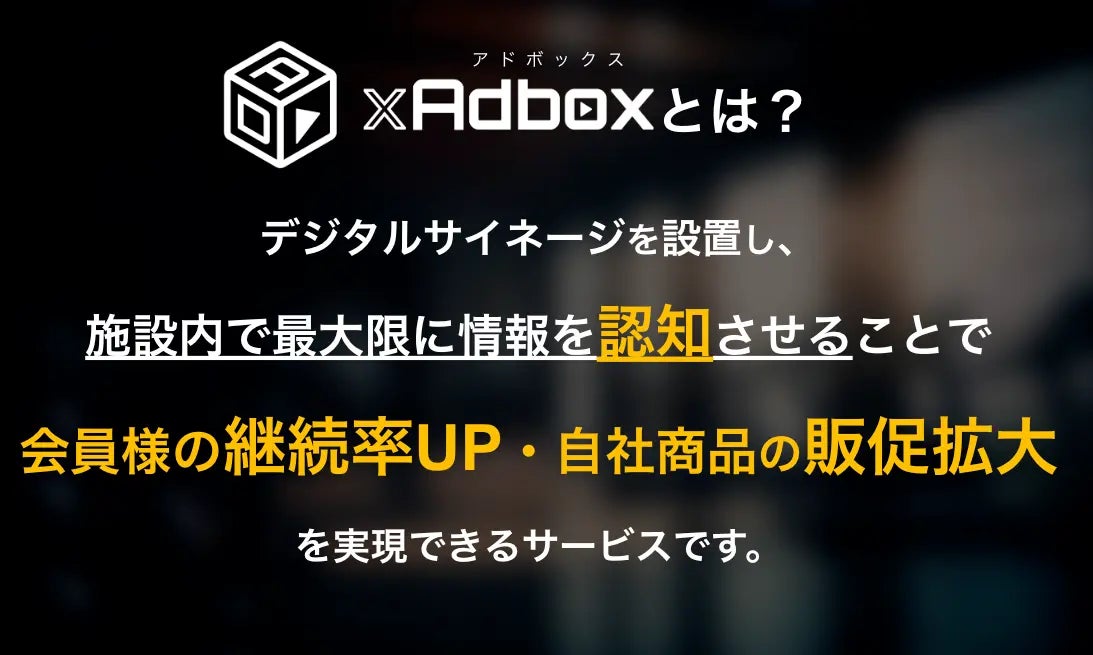「GYM xAdbox」(ジムアドボックス)とは、スポーツジムの施設内の個室空間に【無償で】デジタルサイネージを設置し、 来場者に向けて発信を行い最大限に情報を認知させることで、【会員様の継続率UP・自社商品の販促拡大】を実現できるサービスです。