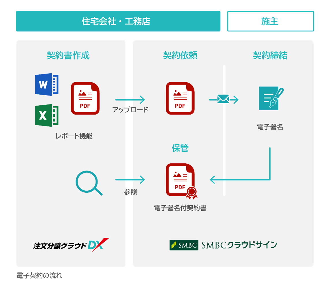 今回、両サービスが連携することにより、請負契約書の作成から締結、保管まで全て電子化され、従来ご好評いただいている電子承認や電子受発注機能と相まって住宅会社の完全なペーパレス化が進みます。