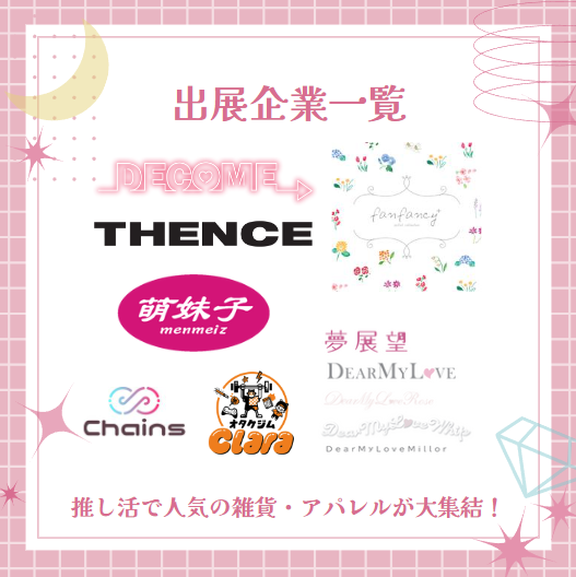 出展企業には、推し活層に人気のアパレル・グッズブランドや推し活アプリが大集結いたします。