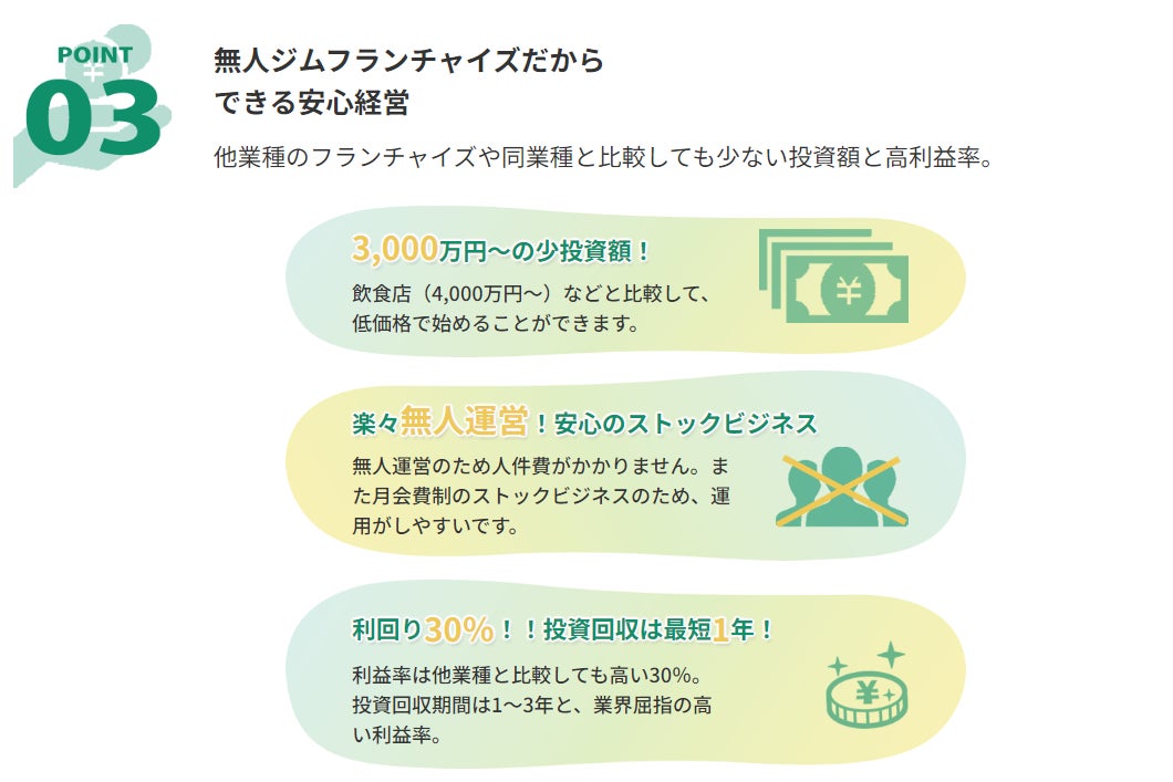 無人運営により人件費がかからないため、利益率は30%程度と高利益を実現しております。