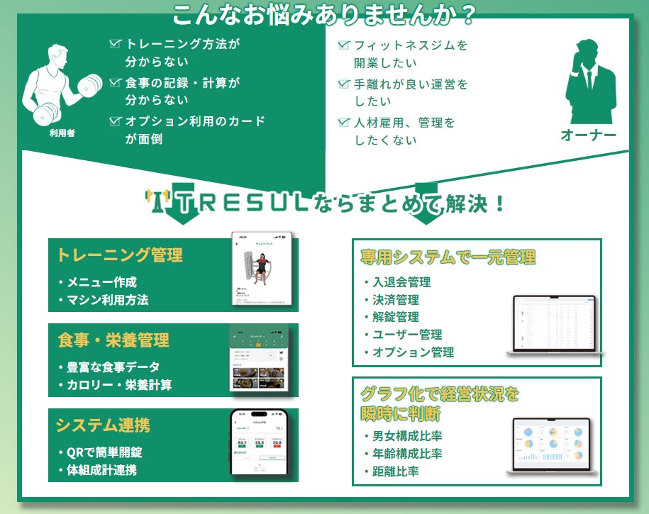 弊社で自社開発しているジム特化型システム「TRESUL」により入会・予約・キャンセルや