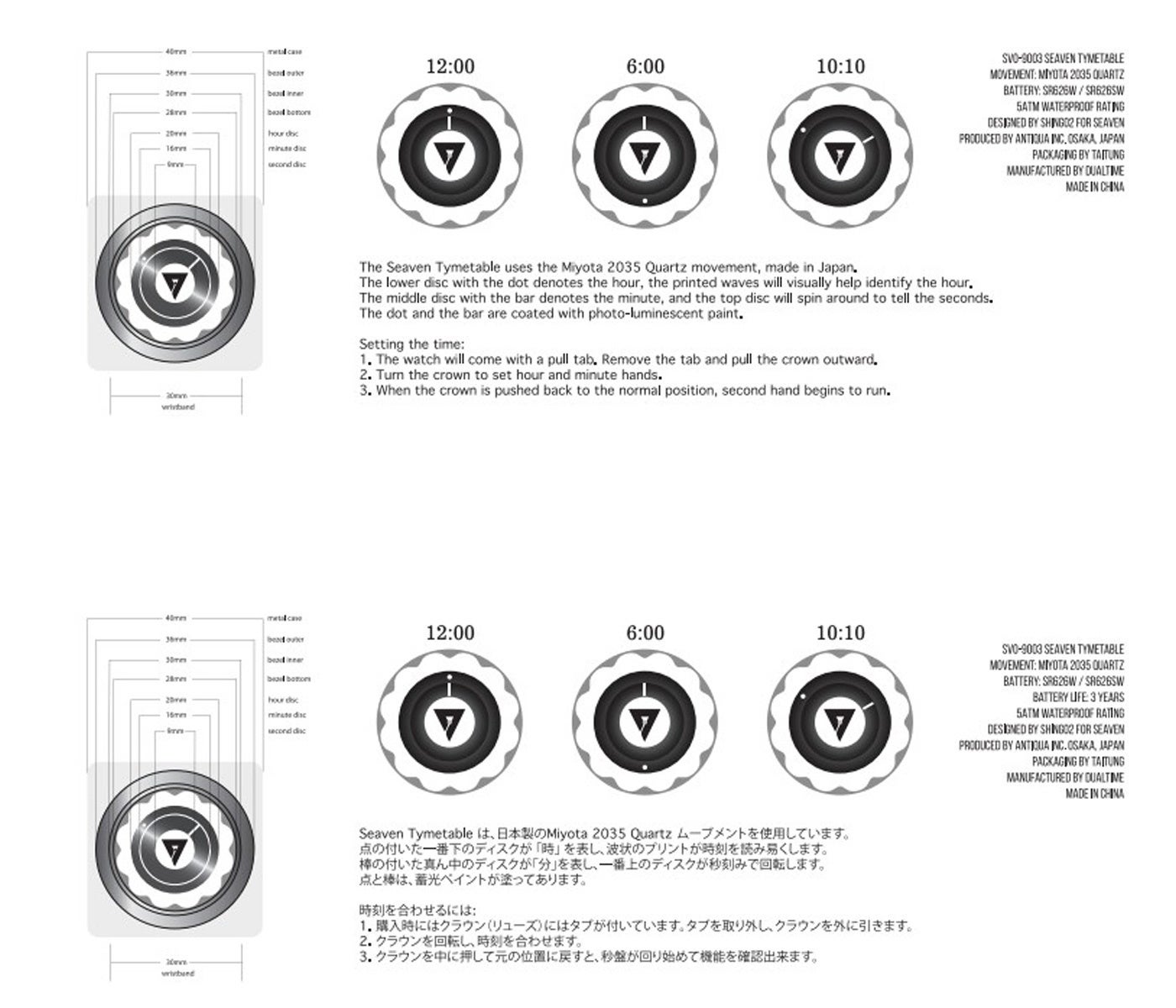 TYMETABLEとは、英語のTimetableとTurntable、そしてRhymeを合わせた造語。時計のデザインはTechnics SL-1200ターンテーブルのプラッターをイメージしたベゼル模様と、レコードの7インチの寸法を元に、黒いアナログレコードと白いラベルを意識した三層の盤から構成されている。時刻はレコードに貼るマーカーを思い起こさせるドットが時を、ラインが分を表し、ラベルが秒を刻むように回る。