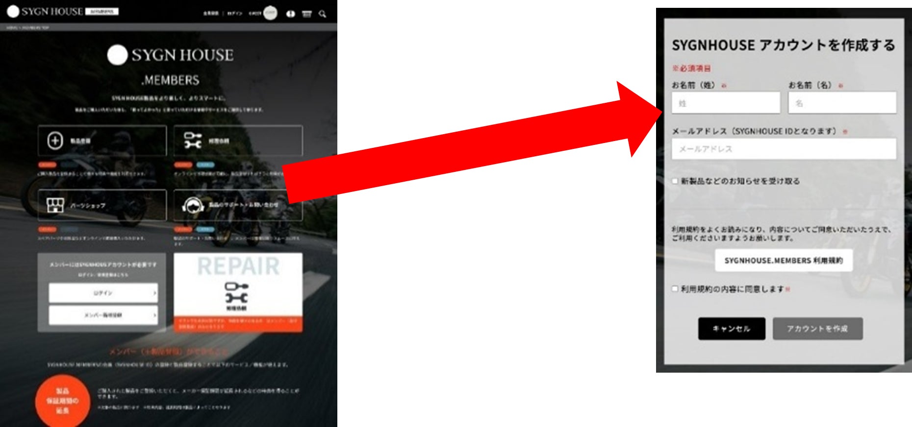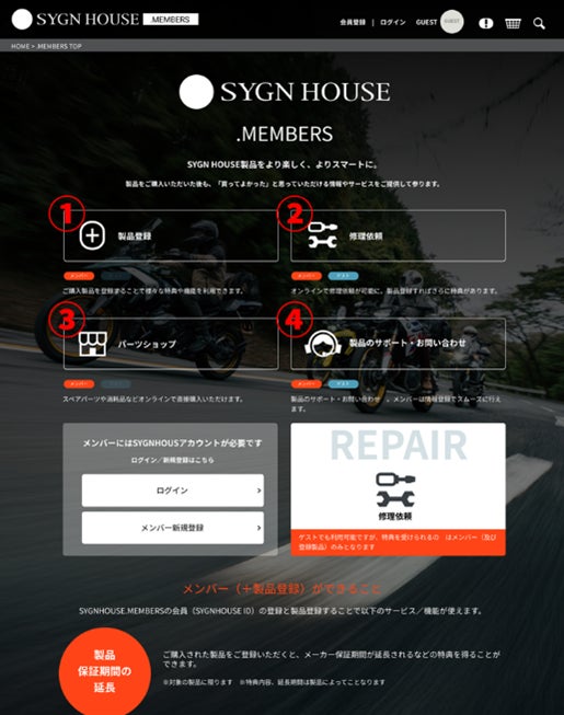 本サービスでは、製品登録、修理依頼、パーツショップ、製品のサポート・お問い合わせの4つのコンテンツを提供します。URLは、https://members.sygnhouse.jp/ です。
