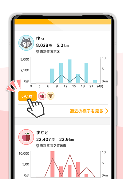 ・ 「みんなの様子」で表示される他のメンバーの歩数・移動距離に対して、「いいね!」のリアクションを送ることができます。仲間からのリアクションをもらうことで、グループで歩いているという「つながり」を感じられます。