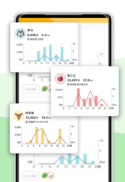 遠くで暮らす家族だけではなく、友人同士、コミュニティ内で、日常の歩数を見やすいグラフで確認でき、“離れて暮らす親の様子をできるだけ簡単に知りたい方”や、“旅行やウォーキングなどの移動を友人との共通の話題にしたい方”には最適なアプリです。