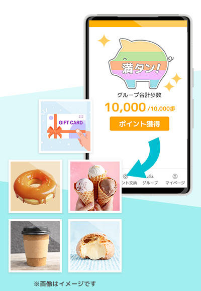 ・ 「みんなのポイント」機能では、みんなの歩数をグループメンバー共同の貯金箱に貯めることができます。10,000歩に到達するとアプリ内で使えるポイントに交換することができます。