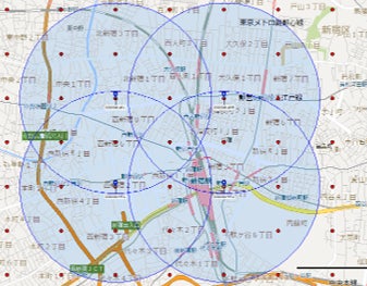 赤い点がメッシュの代表点。青い円のエリアがバッファ商圏。青い円の商圏データの値を円内のメッシュに持たせる処理を行っています。