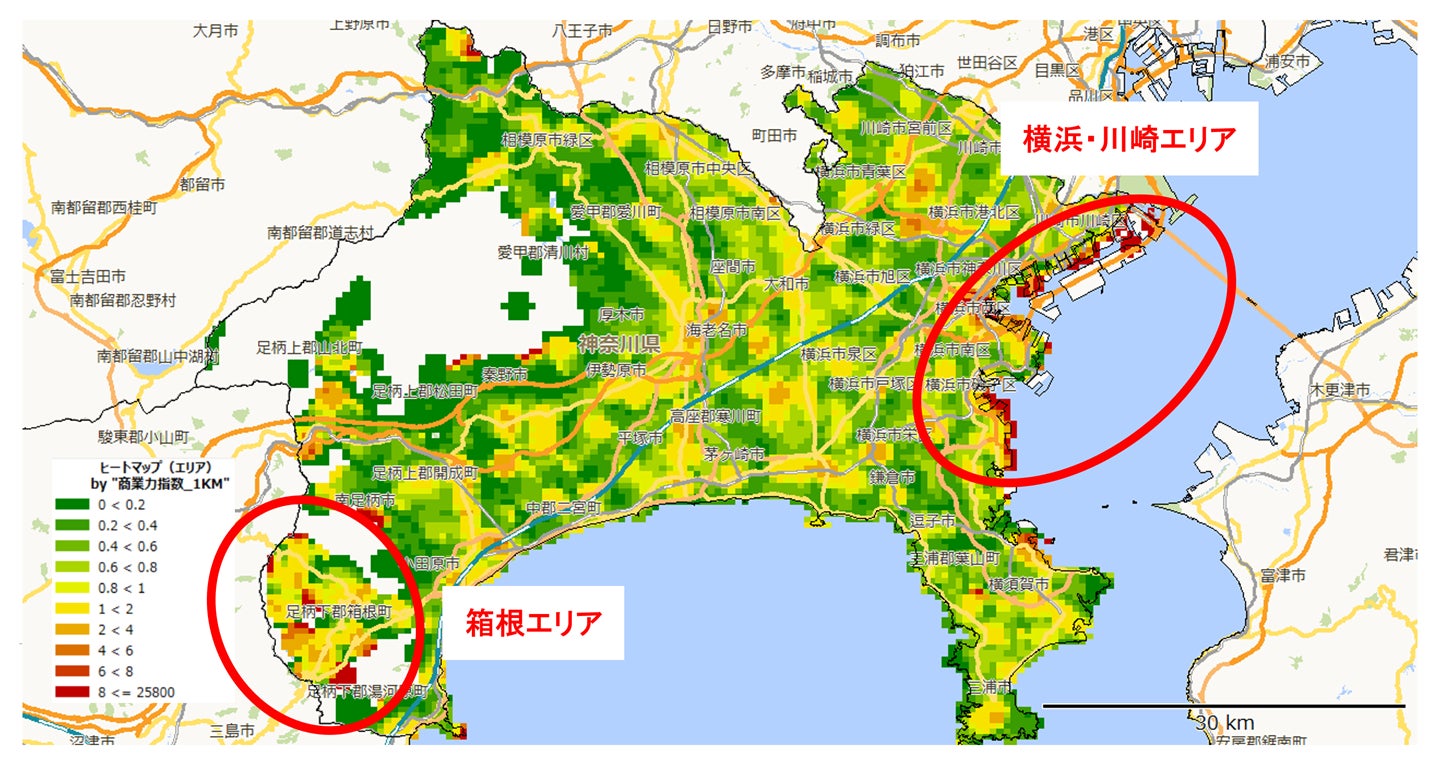 下図は、「MarketAnalyzer🄬 5」で商業統計データを活用した「商業力指数」を可視化した図(神奈川県)です。商業集積の度合いを把握することができます。下図では、横浜・川崎エリアや箱根エリアが指数の高いエリアとして顕著に可視化されています。