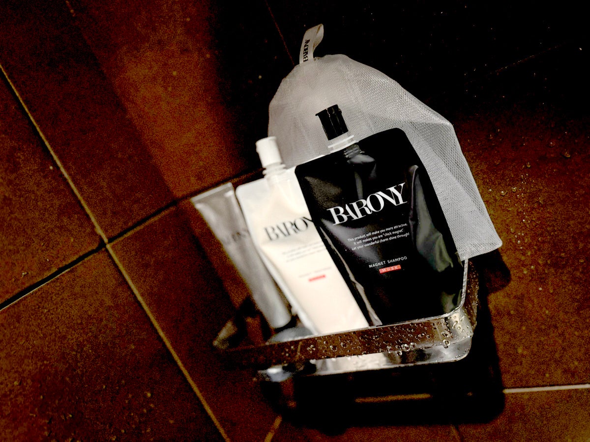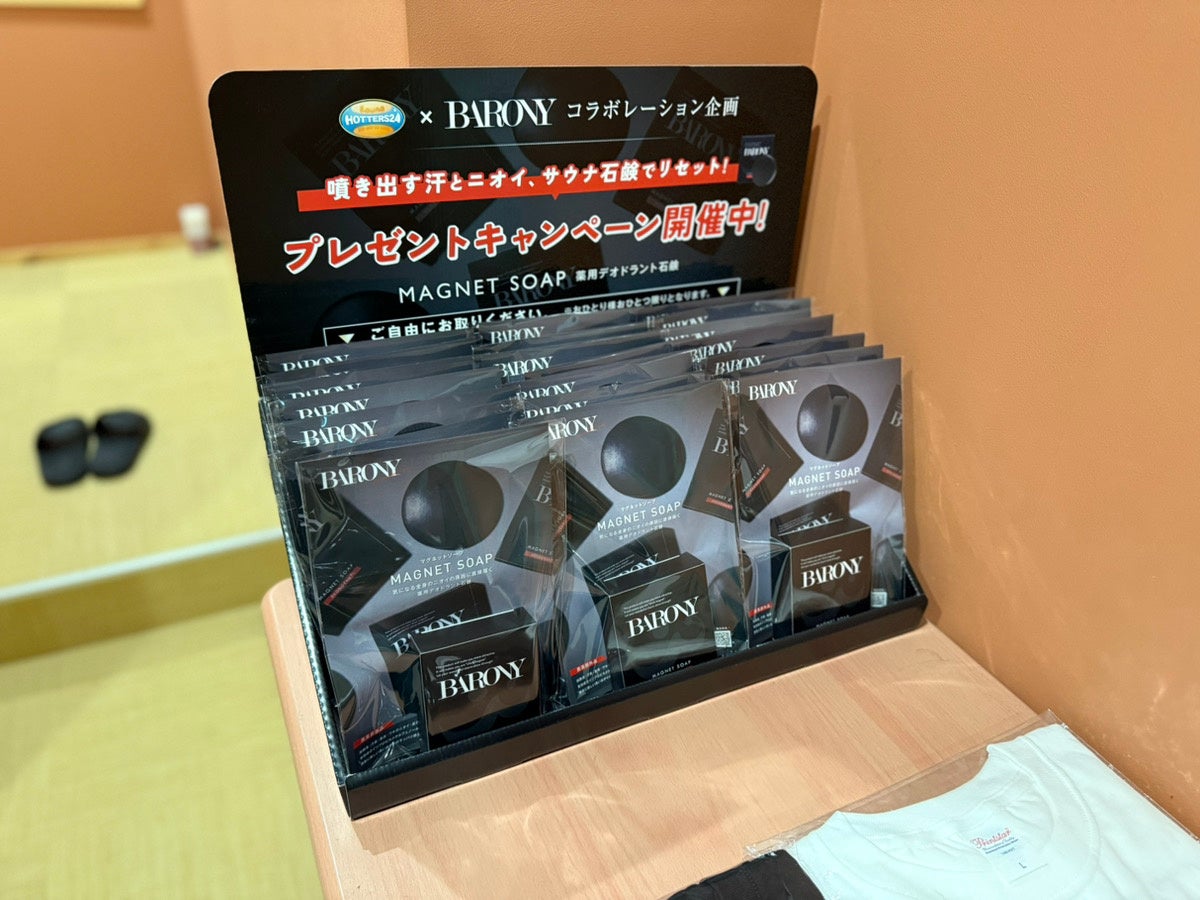 本コラボレーションにより、HOTTERS24の施設内にMAGNET SOAP(デオドラント薬用石鹸)をサンプリングとして設置。利用者の方々が自由にお試しいただける機会を提供いたします。さらに、シャワールームの一つをBARONY専用ブースとして設置し、以下のスキン&ヘアケア製品をご使用いただけます。