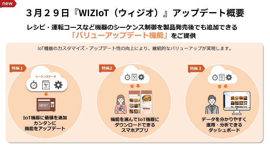 株式会社AIoTクラウド(本社:東京都江東区、代表取締役社長:石黒 豊)は、オンラインセミナー「NANO OPT Media Online」にて、『IoT製品開発・運用をもっと身近で当たり前に~WIZIoT(ウィジオ)で始めるIoT開発・運用~』をテーマに、製品IoT化に必要なツールとサポートをまとめてご提供するIoT開発運用SaaS『WIZIoT(ウィジオ)』の最新情報をいち早くご紹介します。3月29日に提供開始予定のレシピ・運転コースなど機器のシーケンス制御を製品発売後でも追加できる「バリューアップデート機能」について、解説いたします。