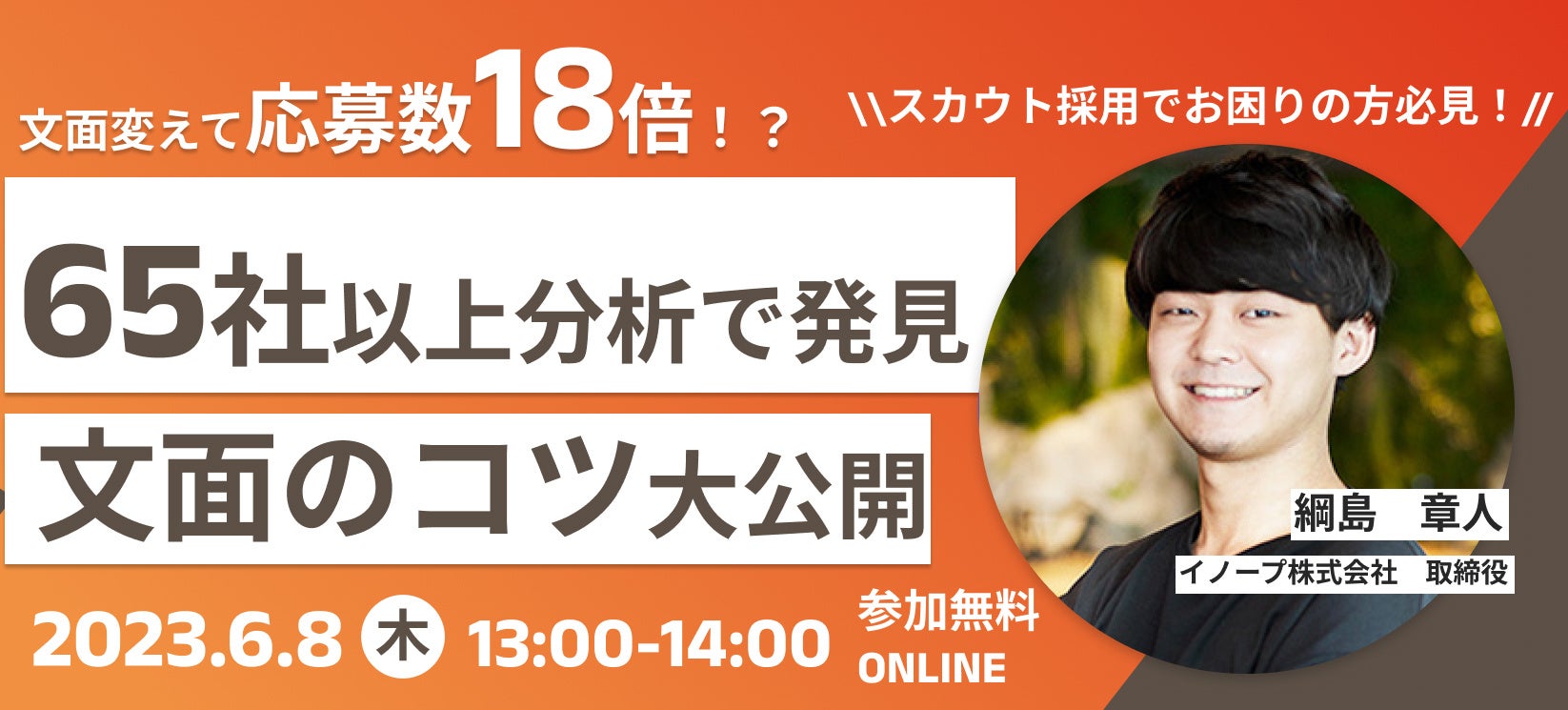 「スカウト採用を導入したが、応募数が当初の予想よりも来ない」「どのような文面がいいかわからない」など、スカウト採用に関して課題を抱えた企業様が多くいらっしゃいます。そこで、採用人事向けのセミナー「【スカウト文面を変えて応募数18倍⁉】スカウト採用で勝ち残る!65社以上の分析で発見したスカウト文面のコツを大公開」を6/8(木)開催いたします。