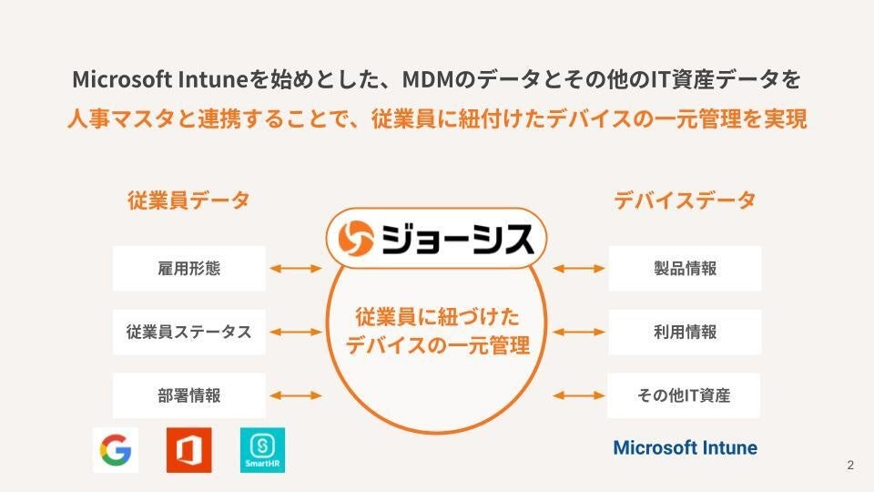 Microsoft Intuneと連携することで、デバイスデータの取得を効率化し、従業員に紐づいた一元的なデバイス台帳管理とガバナンス強化を実現します。(URL:https://jp.josys.com/)