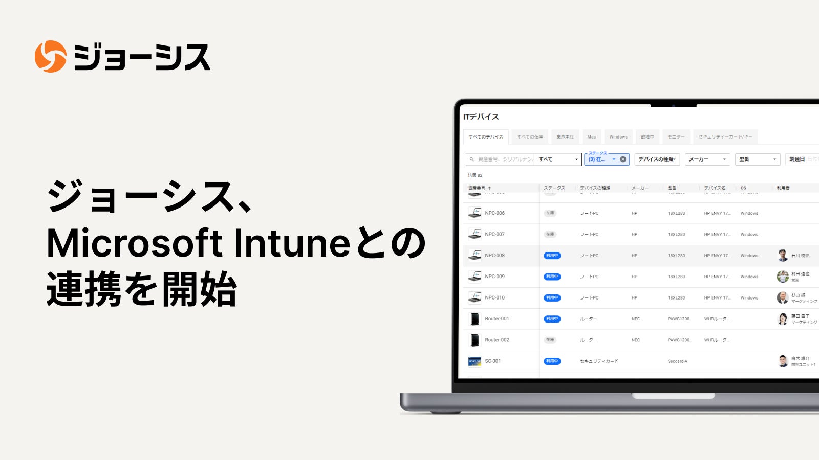 ジョーシスは、全てのMicrosoft Intune管理対象のデバイスや従業員へ未割り当てのデバイス及びその他IT資産を組み合わせて管理することで、デバイス管理の一元化を実現します。