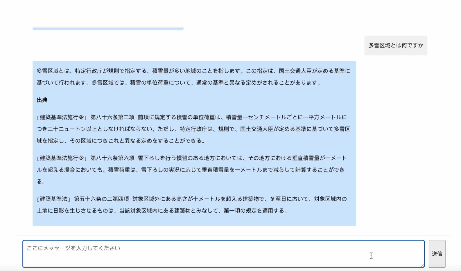 ②質問をすると、回答とともに出典として、法規の参照部分を引用します。