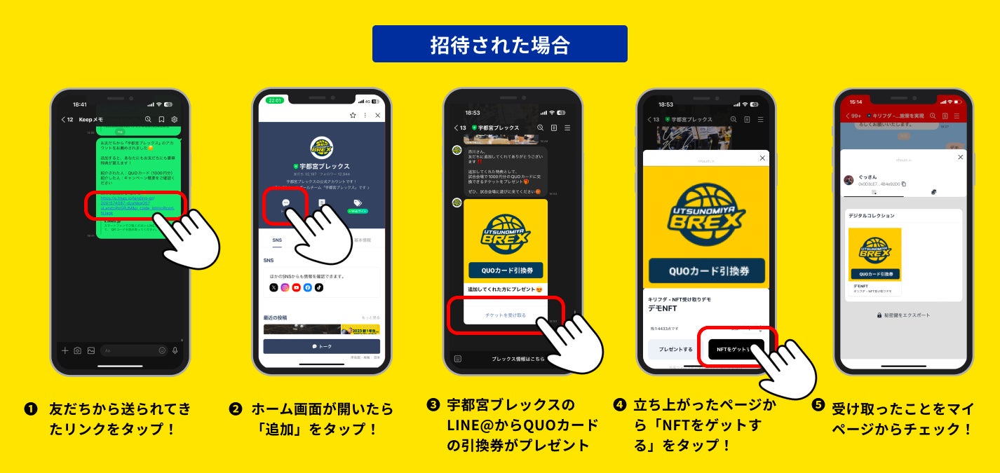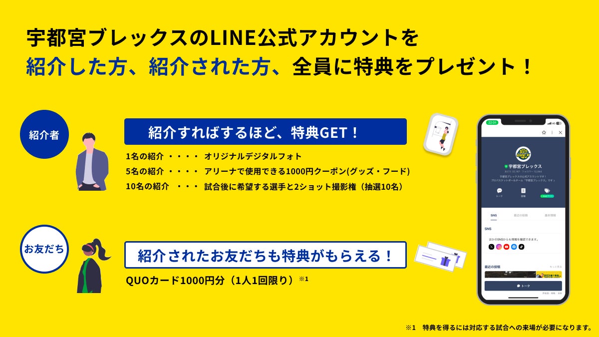 また、紹介されLINE友だちになり、その後、ホームゲームに来場された方にはQUOカード1000円分がプレゼントされます。
