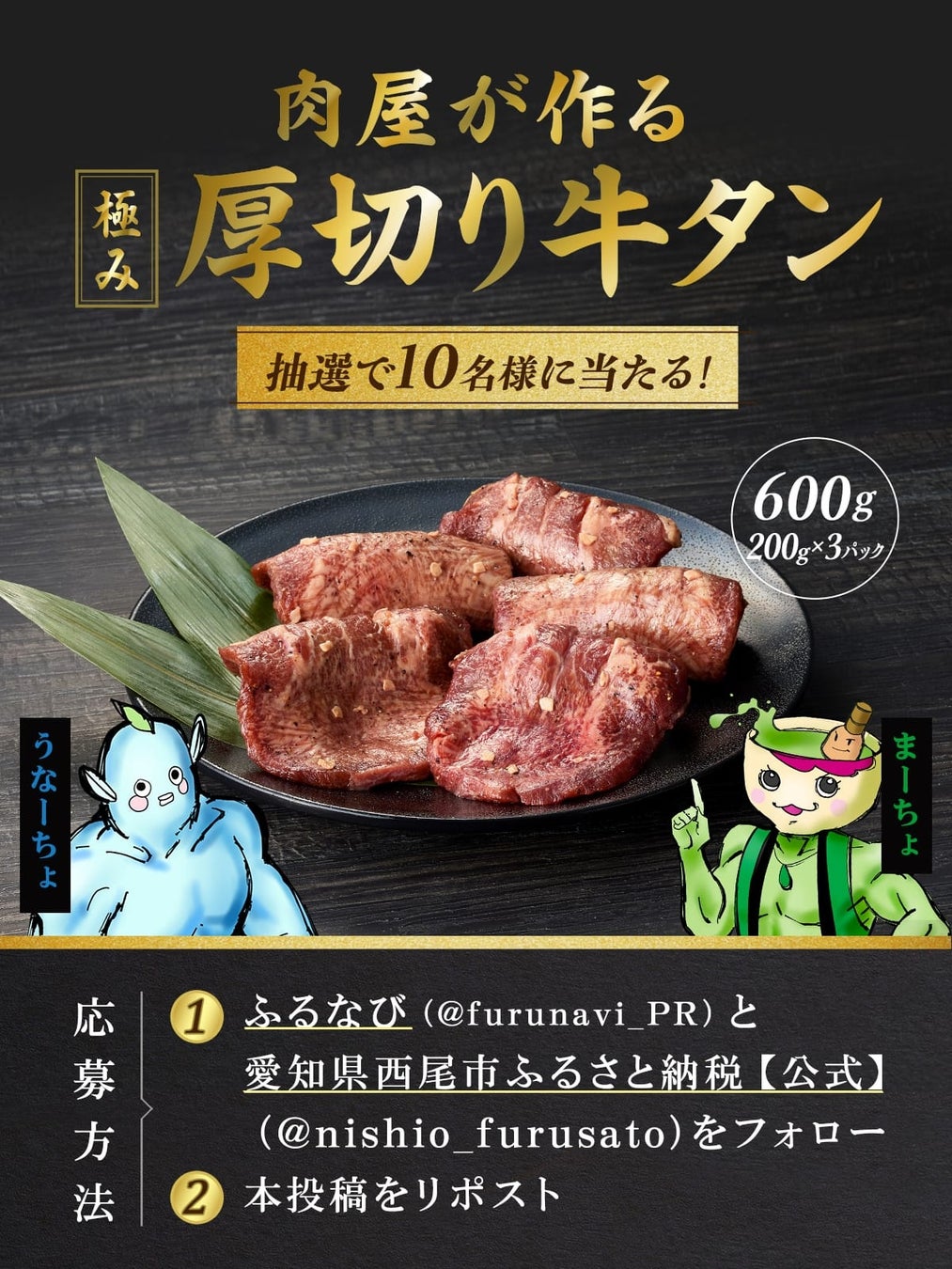 キャンペーン当選者には、4月から西尾市ふるさと納税の返礼品に新登場した「肉屋が作る極み厚切り牛タン 600g」をお届けします。