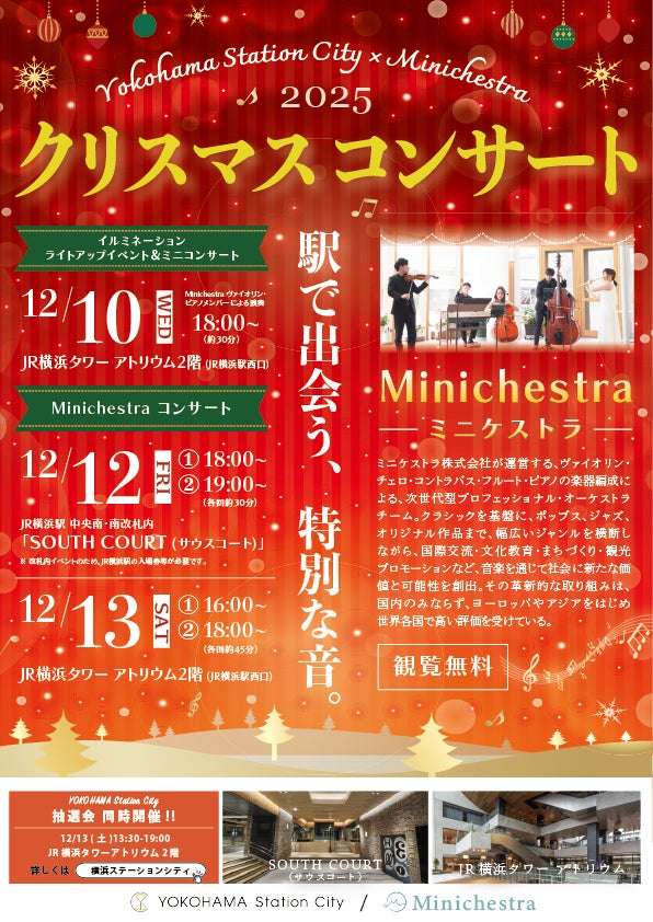 また、2025年12月12日(金)にJR横浜駅 中央南・南改札内 「SOUTH COURT(サウスコート)」、12月13日(土)にJR横浜タワー アトリウム2階(JR横浜駅西口)にて、音楽に包まれた特別なひとときをお楽しみいただけるYOKOHAMA Station City x Minichestra 「クリスマスコンサート」も開催、このほかにも、12月13日(土)には、豪華賞品が当たる「YOKOHAMA Station City抽選会」も開催いたします。YOKOHAMA Station City でお買いものやお食事をお楽しみいただき、素敵なひとときをお過ごしください。