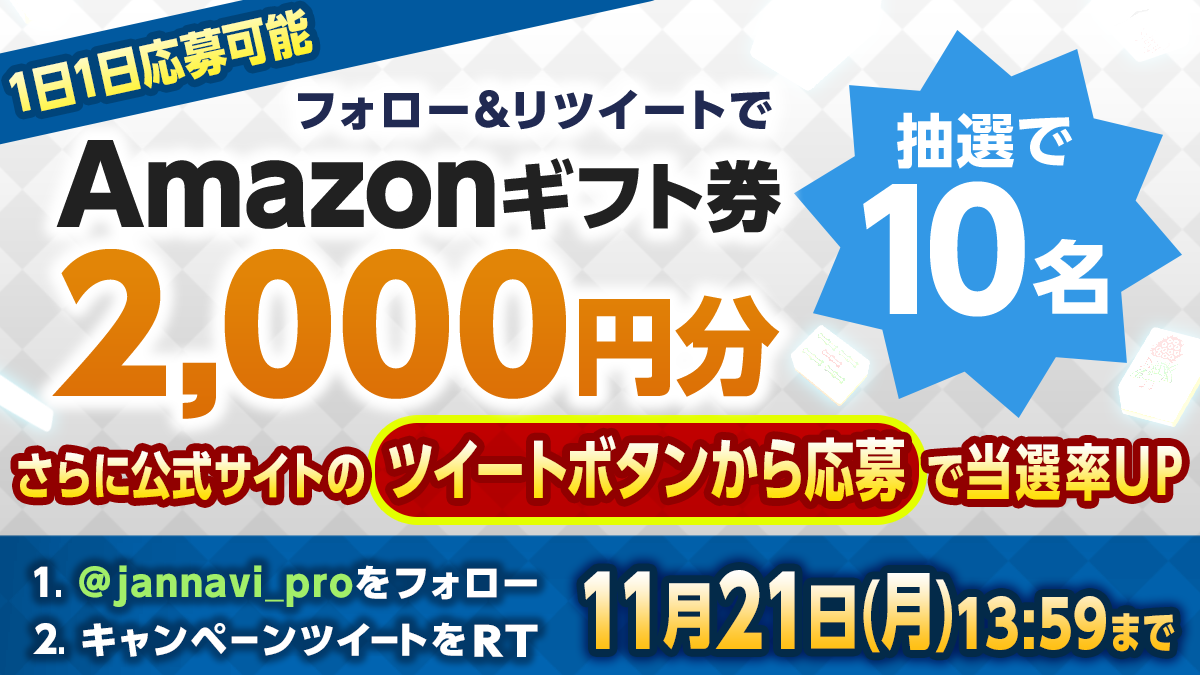 「ジャンナビ麻雀オンライン」amazonギフト2000円分が当たるTwitterキャンペーン開催