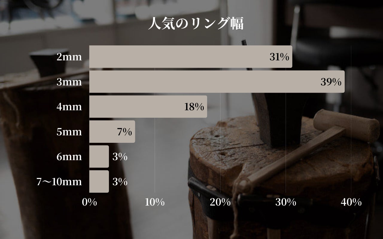2mmと3mmのリング幅が全体の70%を占めており、細身のリングが好まれている傾向があります。特に3mm幅(39%)が最も人気で、シンプルかつ洗練されたデザインを求める顧客層が多いと考えられます。