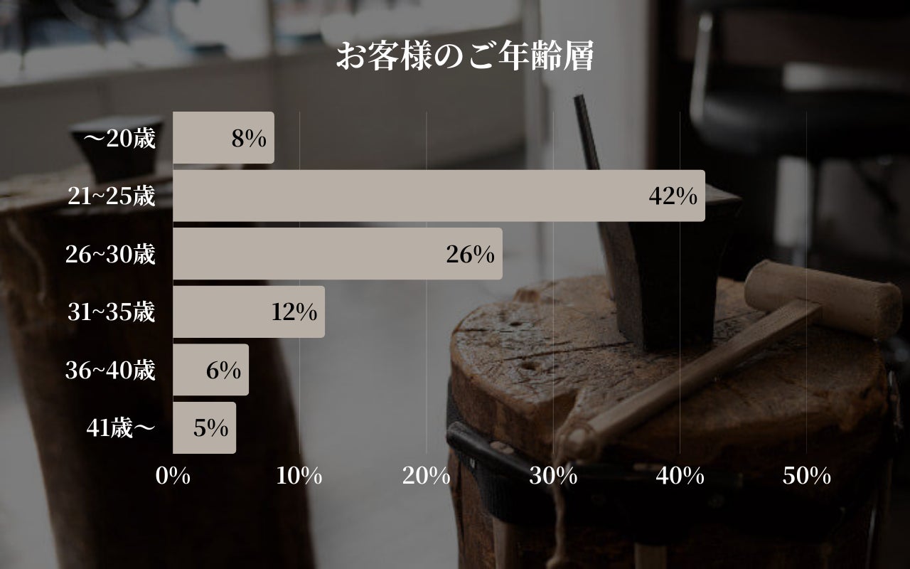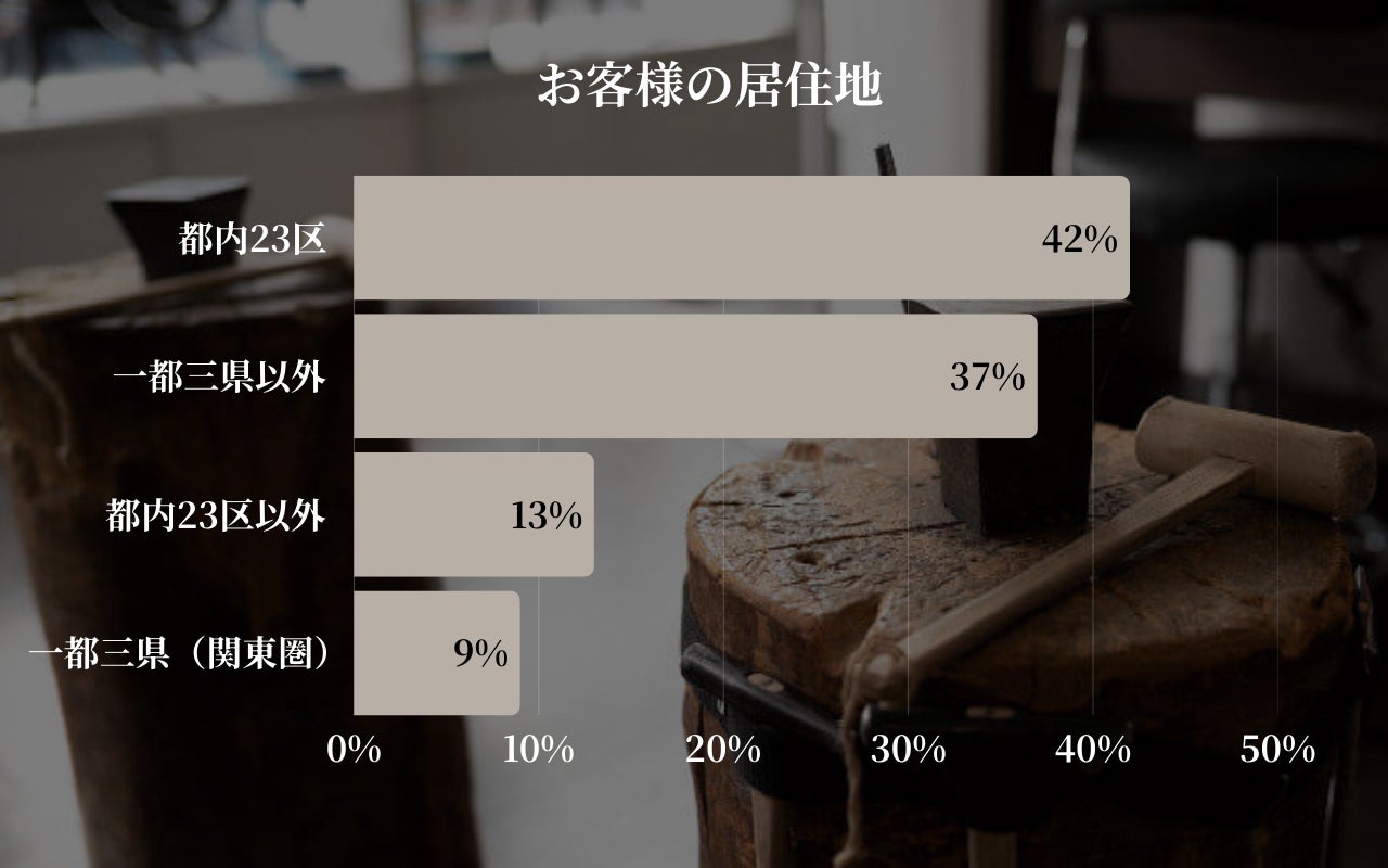 都内23区在住の顧客が最も多く、全体の42%を占めています。一方で、一都三県以外からの顧客も37%と高い割合を示しており、地方からも一定数の集客があることが分かります。都内23区以外や関東圏内(一都三県)の割合は比較的低い結果でした。