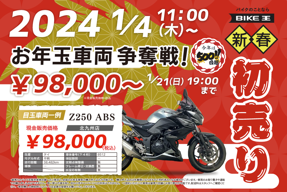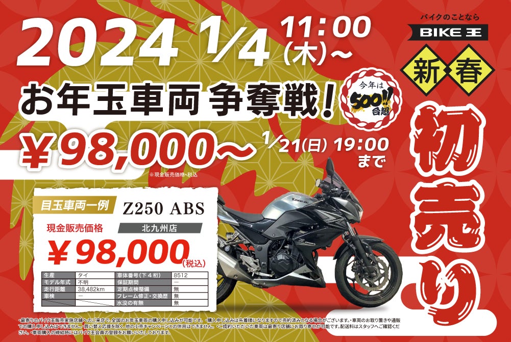 2024年のバイク王の初売りは、昨年からお年玉車両が200台超も増台しパワーアップ!さらにお年玉車両の中から70台以上「24万円特選車」も登場。10万台以上の年間取扱台数を誇るバイク王の豊富な在庫の中から厳選したお年玉車両は、なんと今年は500台超!期間は、2024年1月4日11時から21日19時までの18日間!お年玉車両は先着順となりますので、お早めに!
