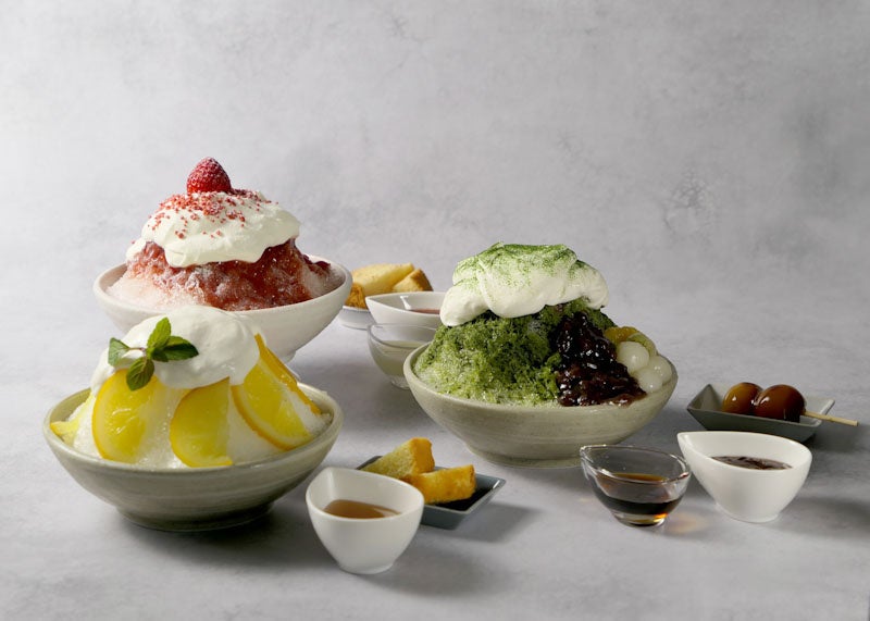 静岡県が誇る美味しい食材と天然の純氷を使ったかき氷。紅ほっぺ、静岡抹茶、静岡マイヤーレモン、三島マンゴー。パティシェ特製のソースと共にご賞味ください。