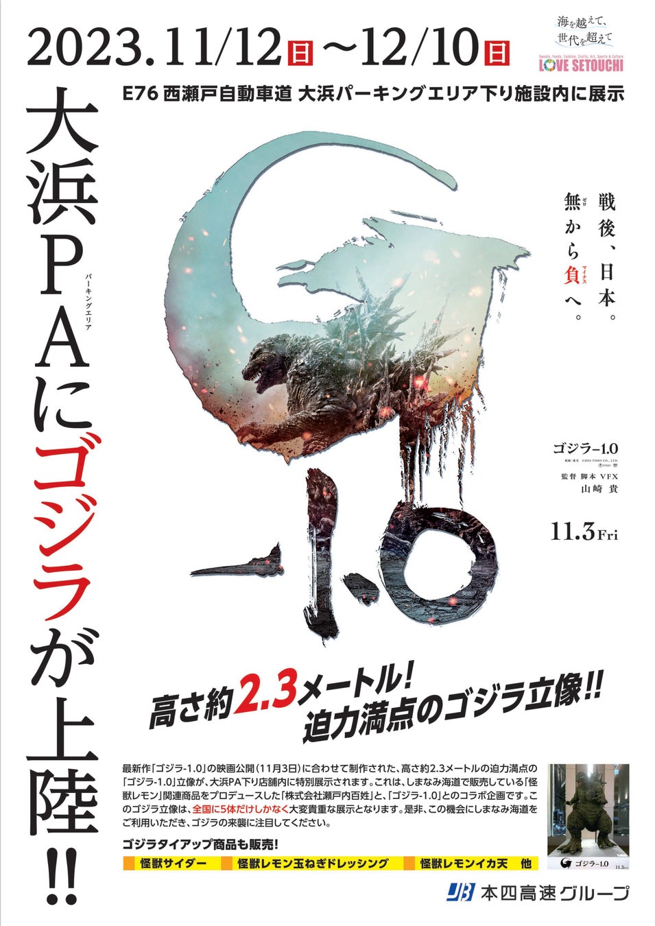 最新作「ゴジラ-1.0」の映画公開(11月3日)に合わせて制作された、高さ約2.3メートルの迫力満点の「ゴジラ-1.0」立像を E76 西瀬戸自動車道(瀬戸内しまなみ海道)大浜パーキングエリア(下り)に 特別展示します。