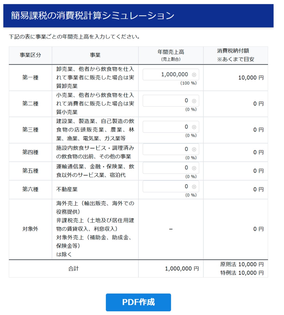 消費税の簡易課税シミュレーションツールの使用例