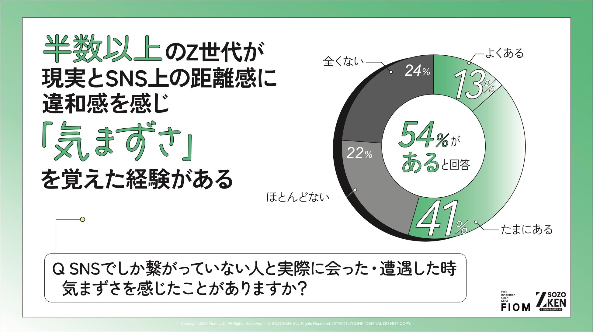 「SNSでしか繋がっていない人と実際に会った・遭遇した時」に気まずさを感じた経験が「ある」(「よくある」13%+「たまにある」41%)と回答したZ世代は54%に上りました 。