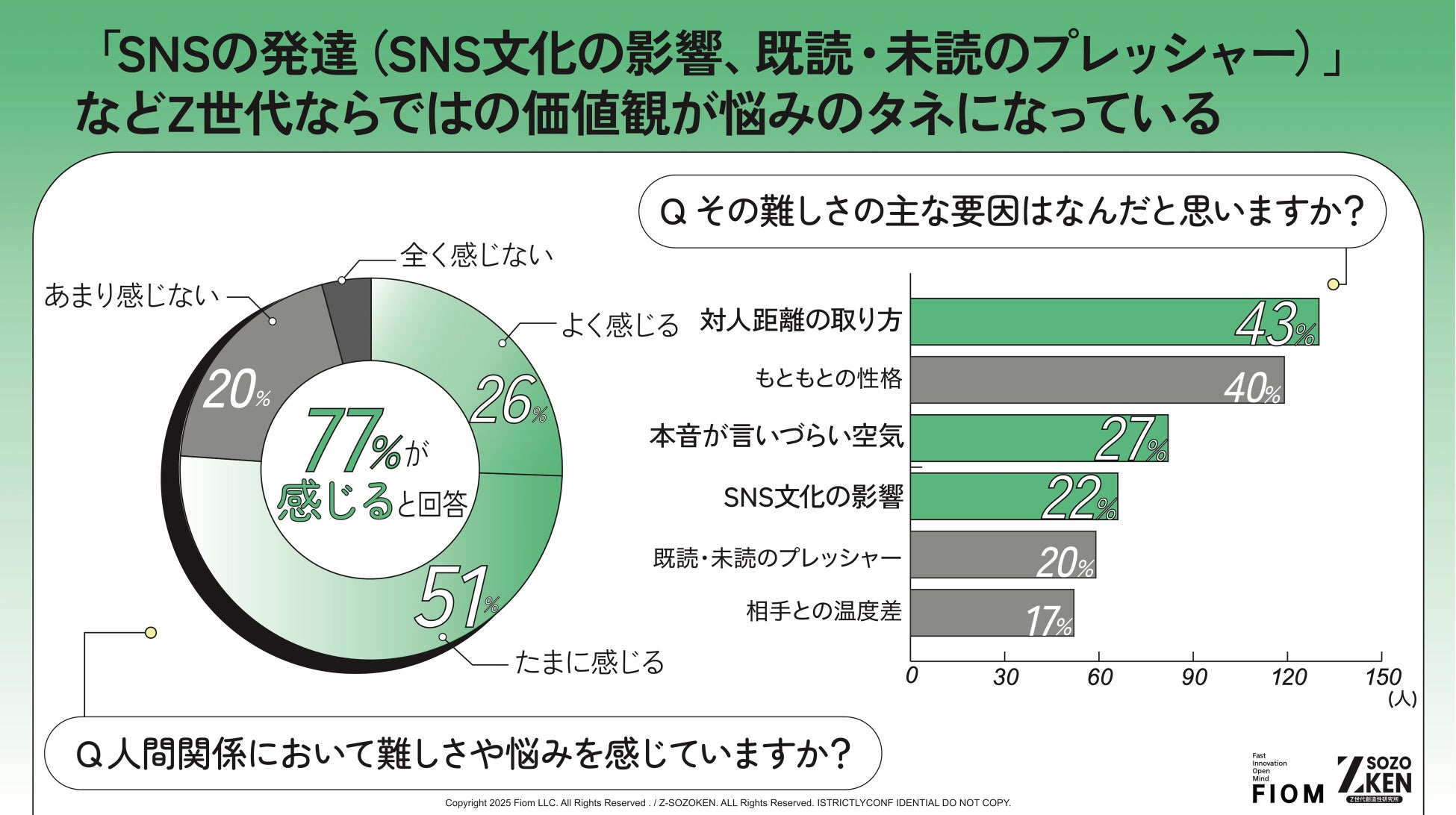 Z世代の77%が「人間関係において難しさや悩みを感じている」 と回答。その要因として、「対人距離の取り方」(43%) に次ぎ、「SNS文化の影響」(22%)、「既読・未読のプレッシャー」(20%) がZ世代特有の悩みとして上位に入りました 。