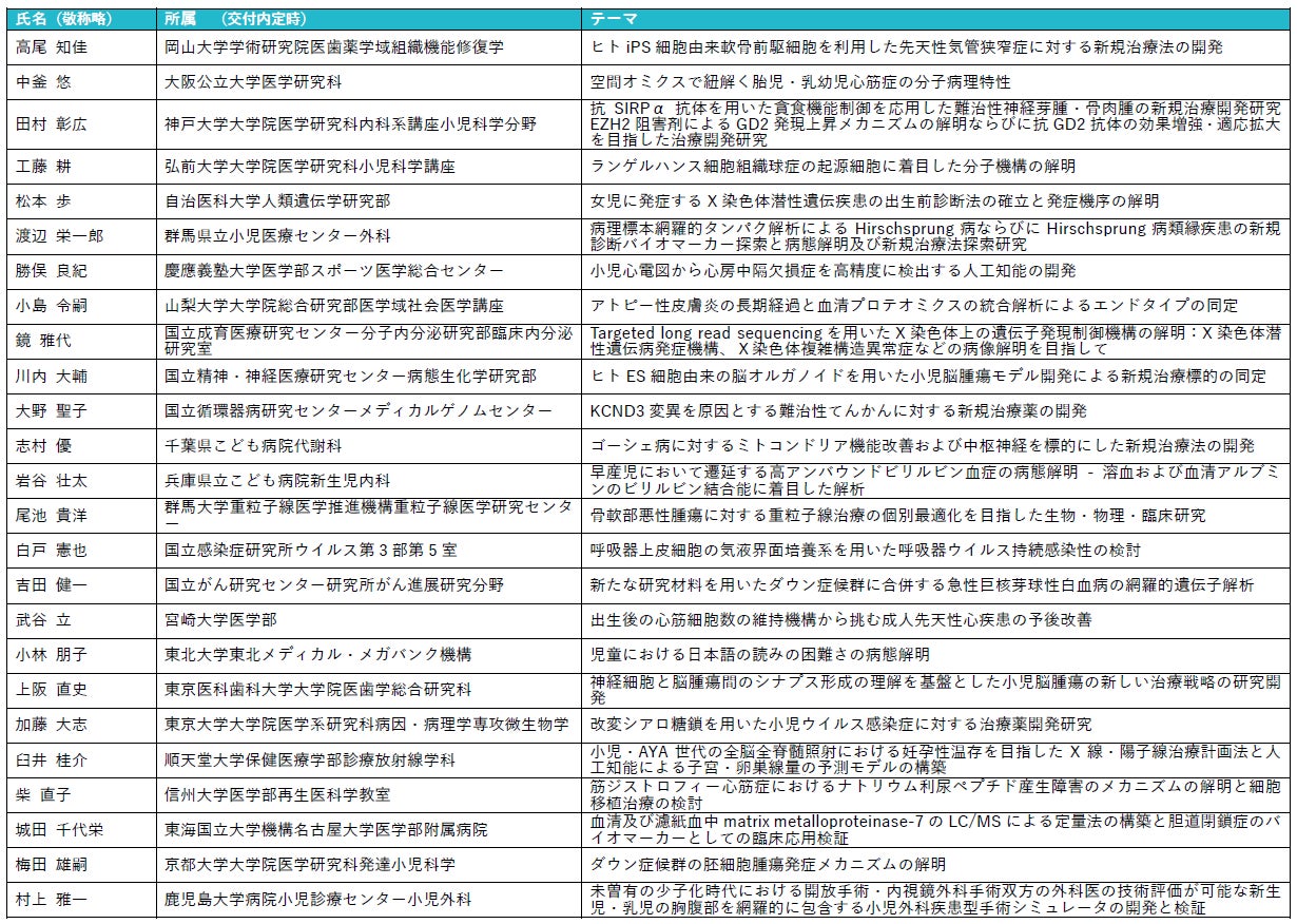 <募集概要> ●対象分野 小児疾患の原因究明・診断・治療・予防等に関する基礎医学的研究、臨床医学的研究および社会医学的研究 ただし、日本国内の研究機関で行う研究に限る ●応募資格 (1)日本国内の総合大学医学部、医科大学、医学研究機関、医療機関等に所属し、日本国内の所属機関で小児医学研究に従事していること (2)申請時かつ助成期間中も(1)を満たしていること (3)所属する組織の責任者から推薦を受けていること (4)2022年度以降に、当財団の研究助成事業において助成金を受けていないこと (5)若手枠の場合は、2025年3月31日時点で、40歳以下であること ●助成内容 一般枠 ~300万円/件、若手枠 ~100万円/件 ●応募方法 申請フォームから受付 (申請フォームは当財団ウェブサイトの募集概要からご確認いただけます) ●応募受付期間 2024年9月2日(月)~2024年11月14日(木) |