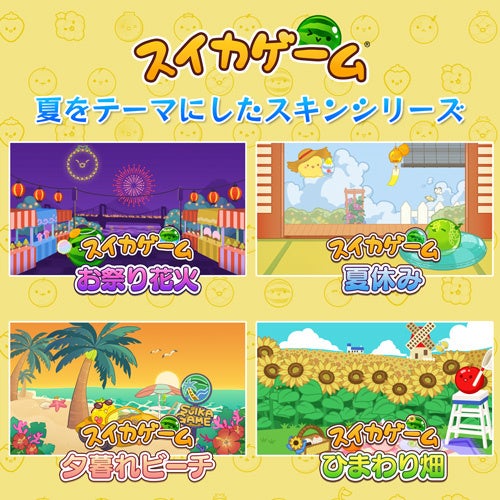 「夕暮れビーチ」「ひまわり畑」「夏休み」「お祭り花火」をテーマに合計4種類のスキンをご用意しています。