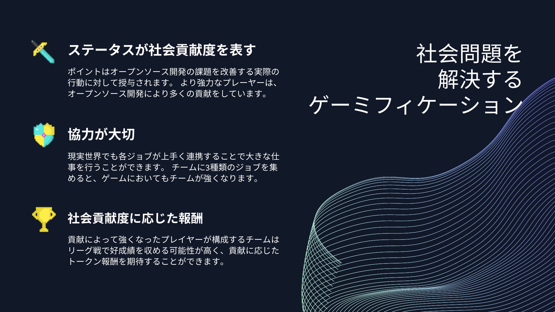 オープンソースへの積極的な投資を増やすことは社会的に重要なミッションです。Epics DAO は社会貢献型ブロックチェーンゲームを開発・運用することでこのミッションを遂行します。