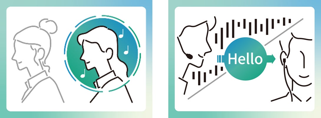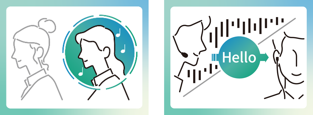 究極の矛盾を両立させる、NTT独自の「PSZ(パーソナライズドサウンドゾーン)」技術※。ある音波(正相)に対し180 度位相を反転させた波形(逆位相)を重ねると音が消える原理を応用。独自のハードウェア設計により耳元の一定エリアに音がとどまるため、耳をふさがなくても周囲への音漏れを最小限に抑えます。