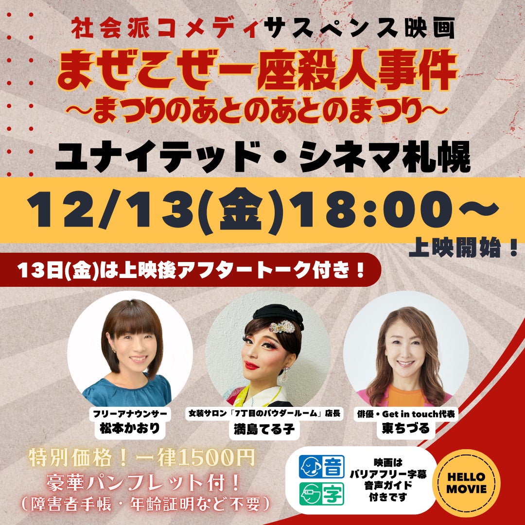 満島てる子(女装店店長)✕松本かおり(フリーアナウンサー)×東ちづるが台本なしのアフタートーク!映画『まぜこぜ一座殺人事件~まつりのあとのあとのまつり~』12/13(金)@ユナイテッド・シネマ札幌