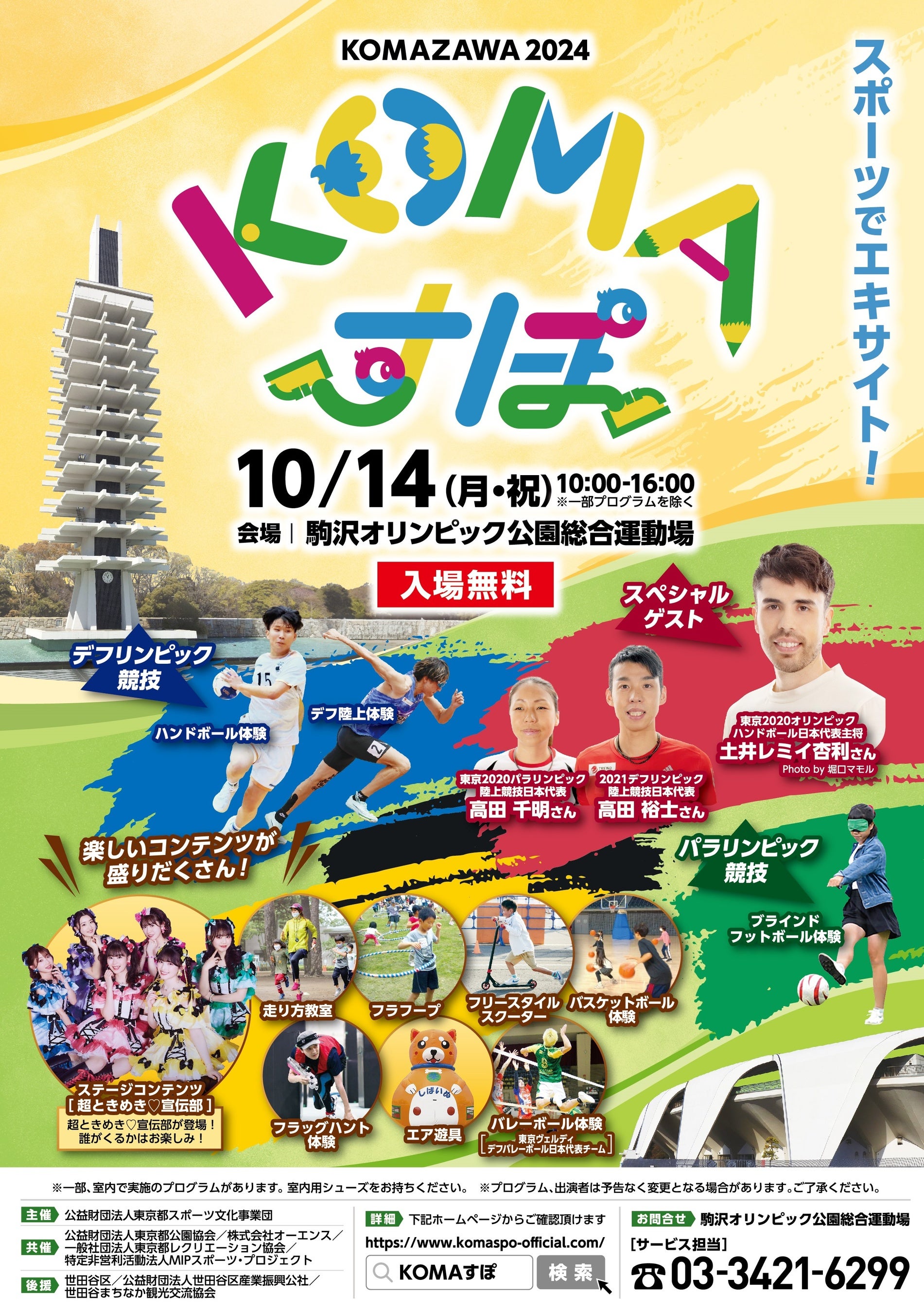 「スポーツで創る東京の未来」をスローガンに、「スポーツフィールド・東京」の牽引役として様々な事業を展開する公益財団法人 東京都スポーツ文化事業団(渋谷区・千駄ヶ谷、以下「東京都スポーツ文化事業団」)は、10月14日(月・祝)「スポーツの日」に合わせ、駒沢オリンピック公園総合運動場にて子供から大人まで誰もがスポーツを楽しく体験できるイベント「KOMAすぽ2024」を開催します。